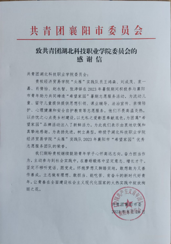 本次支教工作中,“头雁实践队”的教学工作得到了襄阳市团委、枣阳市团委、鹿头镇团委以及学生家长们的大力支持与肯定,团队收到了襄阳市团委的感谢信,被评为2023年襄阳市“希望家园”优秀志愿服务队,4位队员也荣获“优秀志愿者”称号。本次社会实践在中青校园、湖北日报、人民网、中新网等媒体平台被报道15余次。“头雁实践队”的队员们也表示有了很多新的感悟,解锁了“教师体验卡”,收获了别样的风景。