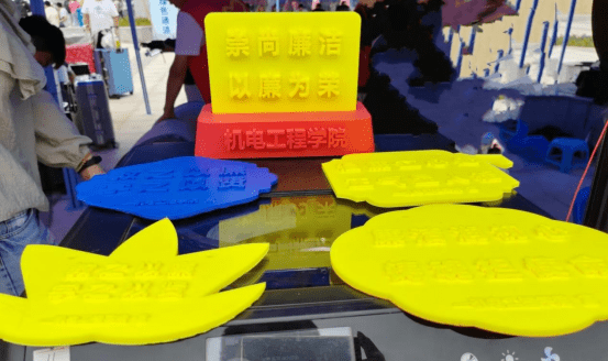 将廉洁文化教育与先进的科学技术相融合是今年迎新的一大特色,学生和老师在迎新现场演示3D打印技术,形成一块块凸显的传播廉洁文化的特殊廉洁牌,既展现了学校的专业特色,又将廉洁之风吹入师生日常生活,让新生学子于入学之初便感受到风清气正的校园氛围,培植校园的廉洁之风。