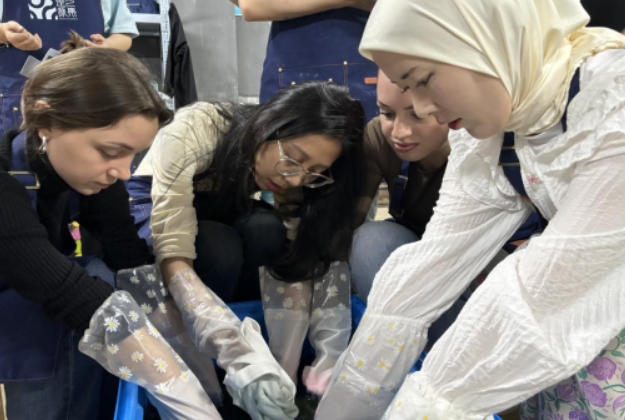 一试一思、一布一染、一绢一韵。19日,中南民族大学何红一教授及留学生一行前往鲁巷校区传媒艺术学院,走进学校非遗研究中心“艺守青蓝”非遗植物蓝染课堂。课堂上,主讲教师欧亚梅从我国传统非遗植物蓝染文化切入,为留学生介绍了蓝染文化情景与工匠技艺精神。