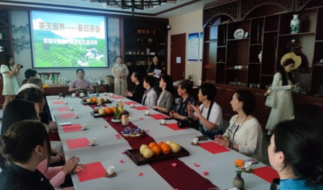 一茶一香,一叶一色、一盏一味。26日,在工商管理学院茶艺实训室,一场别开生面的“茶无国界——春日茶会”课程教学交流在悠扬的琴声中徐徐展开。在主讲教师陈蔚的引导下,大家依次净手、入席后,进入茶会第一个环节--颂钵,大家在钵声中,调整呼吸,沉浸式体验茶艺课。