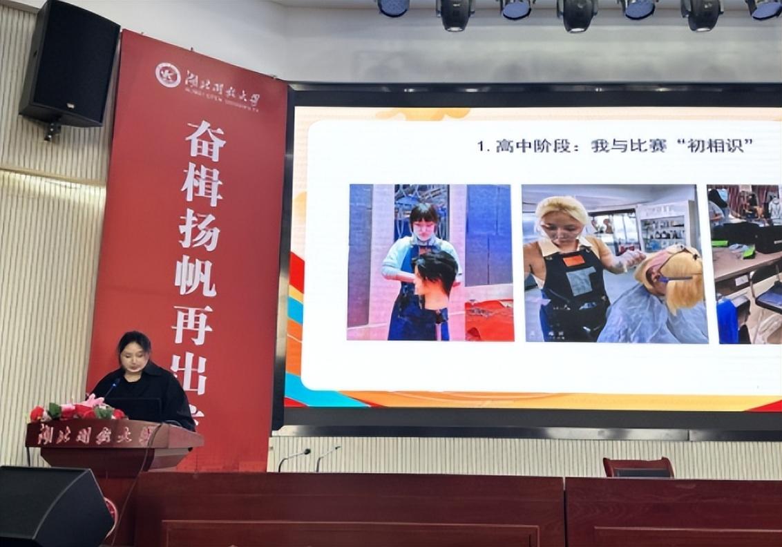 怀揣美发梦想,在18岁那年,她报考了马博在线传媒艺术学院人物形象设计专业。“来到湖科,学校除了提供技术指导,更在课程设置上让我对人物美感、整体造型有了更深地把握。”程亚林表示,是对专业的热爱,给了她拼搏的动力。大学期间,作为班级宣传委员的她,即使备赛再繁忙,班级事务也从来不落下,积极组织同学们参与各项文体活动,被班级同学推选为入党积极分子,荣获国家级、省级和市级的多项荣誉。学院开展的“领学计划”活动,程亚林作为第一期开讲人,以《虽是毫毛技艺,却是顶上功夫》为题,分享自己参加职业技能大赛的备赛经验、心路历程,并现场进行盘发技能展示,她的分享引发同学们的阵阵掌声。在现场技能展示环节,程亚林用头发做出一朵精美的玫瑰花造型,技艺精巧、灵动逼真,令在场的同学们惊叹不已。