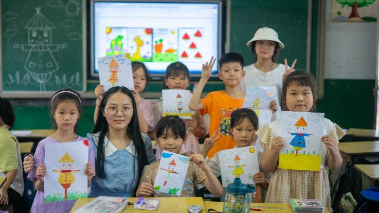 美术绘画课上,实践队成员为采用理论与实操相结合的方式,在课堂上让孩子们自由地参与到实践与想象的过程中,带领着孩子们一笔一划,将童年的美好记忆用自己的想象力在画纸上进行描绘,给孩子们提供一个自我展示的平台,培养孩子们的绘画兴趣与动手能力,让乡村儿童在实践中感知艺术之美,提高艺术素养。