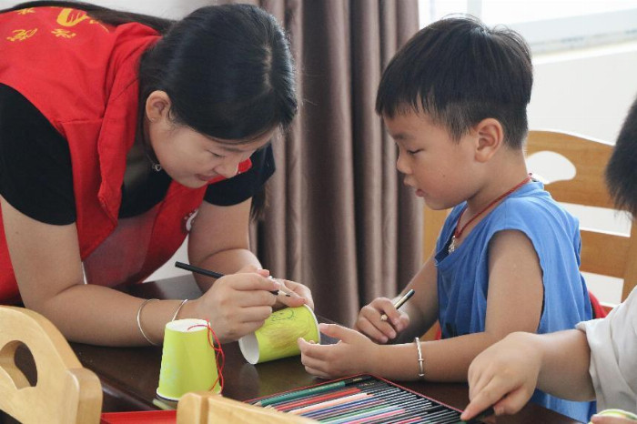 (图为头雁实践队成员在帮助小朋友绘画剪纸图案)