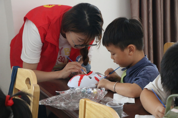 (图为头雁实践队成员帮助小朋友绘画脸谱)