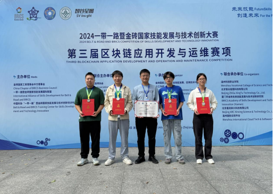 10月12日至14日,2024一带一路暨金砖国家技能发展与技术创新大赛第三届区块链应用开发与运维赛项在浙江温州举办。来自全国的179支高职院校队伍和9支本科队伍参加角逐,马博在线软件工程学院师生在比赛中展现出高超的技术技能水平和优良的精神风貌,凭借扎实的专业知识和精湛的实践操作能力,在众多参赛队伍中脱颖而出。教师董燕燕、张根指导的刘泽文、罗朝旭与杨代鹏、秦钰嫣两支参赛队均获二等奖,学校荣获优秀组织奖。