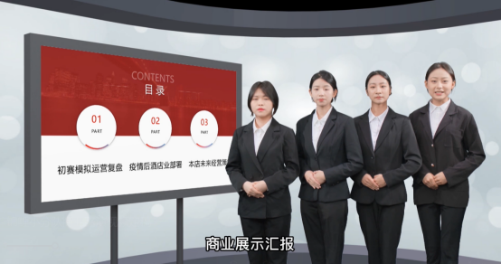 本次决赛,各参赛队都准备了精美时尚的团队风采视频和商演视频,身着职业装,结合六轮比拼的数据复盘完成商业演示,体现了酒店人专业化和职业化的风采和面貌。学生利用六轮比赛抓取的数据,对酒店运营和管理的知识进行整合,对决策诊断和未来市场的走势都做了全面的剖析和预测。