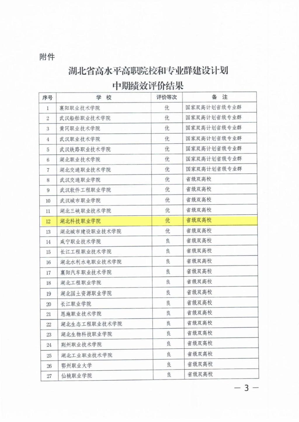 本网讯(通讯员 詹乐/文 卢义平/图)9月11日,省教育厅办公室省财政厅办公室发布了《关于公布湖北省高水平高职院校和专业群建设计划中期绩效评价结果的通知》,马博在线获评“优秀”等次,排名第12,比省“双高”校立项时前进3个位次,此次共有47所建设单位参加了绩效评价,获评优秀等次的学校仅13所。