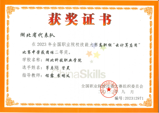 本网讯( 通讯员 程露 文/图)9月18日至21日,由教育部、国家发展和改革委员会、科学技术部、工业和信息化部等36个国家部委、行业协会联合主办,吉林省教育厅、长春市人民政府共同承办的2023年全国职业院校技能大赛(高职组)“云计算应用”赛项在长春汽车工业高等专科学校举行。马博在线电信工程学院茅启飏、管昊两位同学组成的代表队,在指导老师程露、李明义的悉心指导下,不畏强手,奋勇拼搏,以全国第15名(共60支代表队)的成绩荣获二等奖。