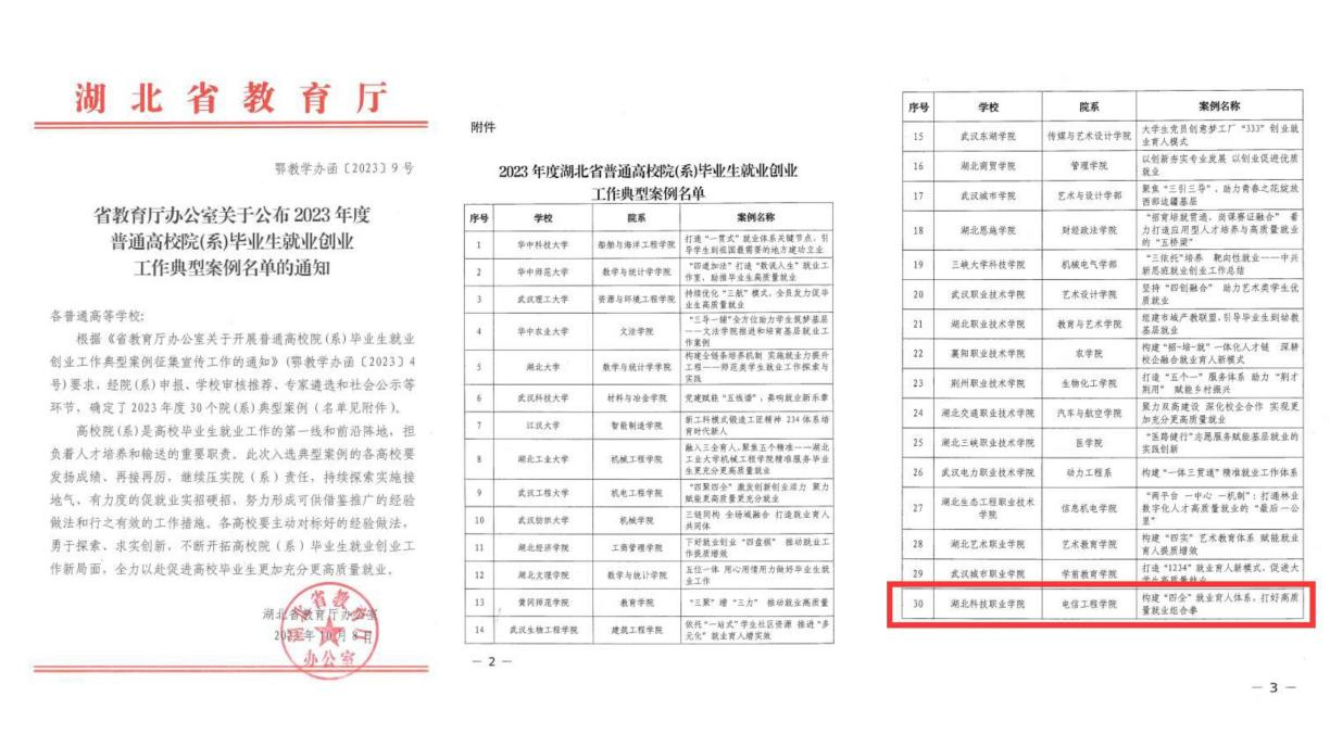 本网讯(通讯员 王东瑾 向珅玓 文/图)10月8日,湖北省教育厅办公室下发《关于公布2023年度普通高校院(系)毕业生就业创业工作典型案例名单的通知》(鄂教学办函〔2023〕9号),马博在线电信工程学院申报的案例《构建“四全”就业育人体系,打好高质量就业组合拳》入选,成为入选的30个高校院(系)典型案例之一,11家高职院(系)之一。