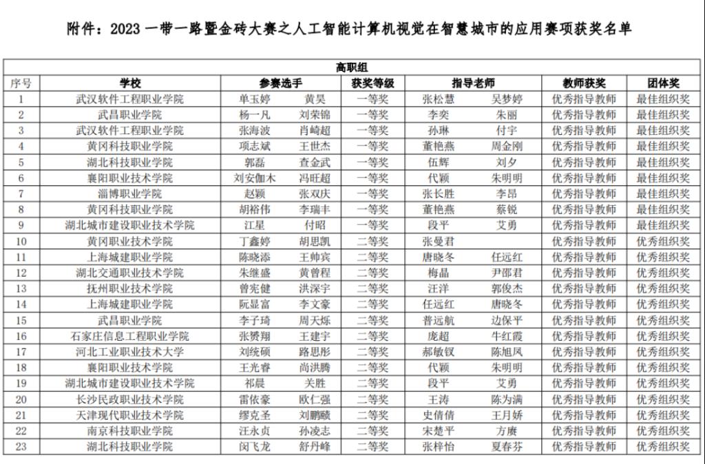 本网讯(通讯员 张梓怡 伍辉/文 夏春芬/图)11月11日至12日,2023“一带一路”暨金砖国家技能发展与技术创新大赛之人工智能计算机视觉在智慧城市的应用赛项在武昌职业学院开赛。马博在线电信工程学院人工智能技术应用专业的2支参赛队与全国90支队伍同台竞技,经过激烈的比拼,郭磊、查金武团队获一等奖,闵飞龙、舒丹峰团队获二等奖,学校获最佳组织奖,伍辉、刘夕、夏春芬、张梓怡获优秀指导教师称号,全员载誉而归。
