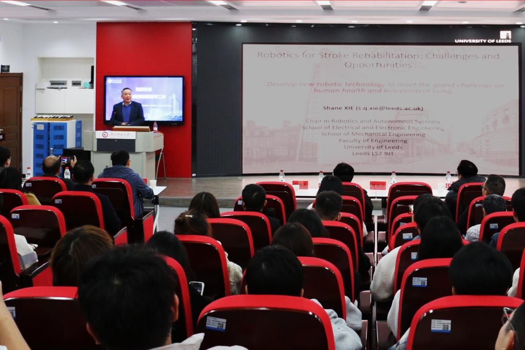 谢胜泉教授以《智能康复与医疗:机会与挑战》为主题,从中风康复现象切入,对智能机器人与康复的研究现况、社会需求及应用进行详细讲解,并介绍了他的科研团队在踝关节评估与康复机器人、通用双臂康复机器人、可穿戴驱动器等领域的最新研究进展及现实应用。他指出,康复机器人显著提高了患者的康复治疗效果,提升了患者的生活质量,具有重大且深远的意义。整场报告主题突出、内容丰富、视野开拓、深入浅出,极大加深了在场师生对于人工智能及康复机器人领域的了解和认识。现场师生代表积极向谢教授提问,谢胜泉教授针对这些问题进行耐心细致地解答。