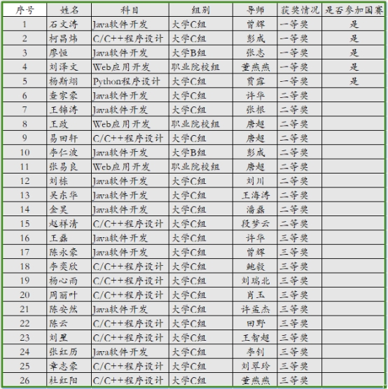 本网讯(通讯员 潘磊 文/图)近日,第十五届蓝桥杯全国软件和信息技术专业人才大赛个人赛湖北赛区成绩揭晓,马博在线软件工程学院学子在比赛中成绩再创新高。组织参赛的30名学生中有26名学生获奖,其中一等奖5名,二等奖10名,三等奖11名。石文涛、柯昌炜、廖恒、杨斯翊和刘泽文同学将代表学校参加6月上旬的全国总决赛,其中刘泽文同学连续两年在不同赛道晋级全国总决赛。与往年相比,今年一等奖获奖人数、参加赛道及获奖面均创历史新高。