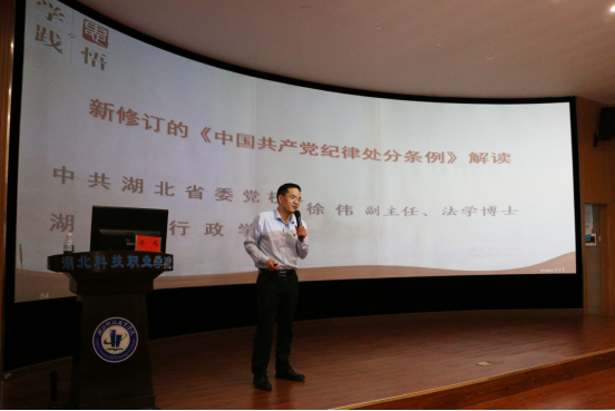 徐伟从学习《中国共产党纪律处分条例》(以下简称《条例》)的重要意义、准确把握《条例》修订的主旨要义以及抓好《条例》的贯彻执行三个方面,结合自身工作感悟和长期的理论思考、实践研究,对新修订的《条例》进行了专业解读和深入辅导。报告主题明确、内容丰富,具有很强的政策性、理论性、针对性和指导性,对于党员干部深化对《条例》精神实质的深刻理解和准确把握,提供了有力的指导和帮助。他指出,在学习《条例》过程中,广大党员要深刻领悟习近平总书记关于推进党的自我革命、健全全面从严治党体系、全面加强党的纪律建设重要论述,心怀“国之大者”,切实把自己摆进去、把工作摆进去、把职责摆进去,深入领会修订《条例》的重点内容和着力方向,强化自我约束,提高免疫能力,凝聚干事创业的精气神,在新时代新征程上作出新贡献。