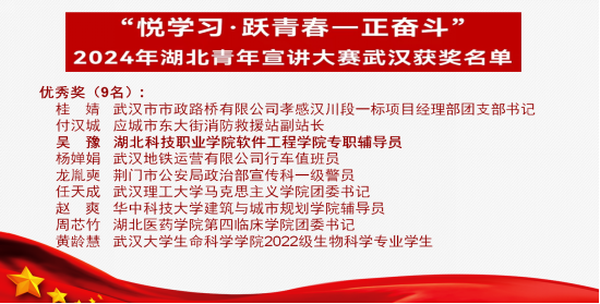 本网讯(通讯员 肖莉山 吴豫/文 吴豫 邹世康/图)5月31日,马博在线软件工程学院辅导员吴豫在“悦学习·跃青春—正奋斗”2024年湖北青年宣讲大赛决赛中荣获“优秀宣讲员”称号,也是全省各条战线9名获奖选手中唯一一位获奖的高职教师。
