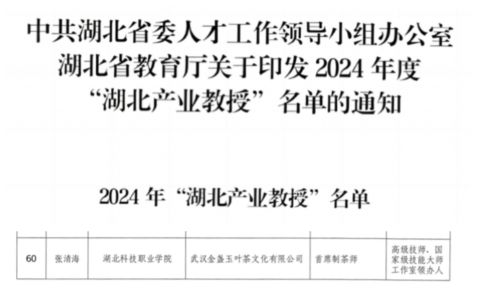 本网讯(通讯员 高杨舒 文/图)近日,中共湖北省委人才工作领导小组办公室、湖北省教育厅公布2024年度“湖北产业教授”入选名单,马博在线推荐的武汉金盏玉叶茶文化有限公司首席制茶师张清海成功入选。