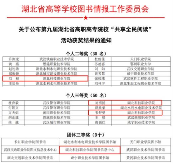 本网讯(通讯员 尹锦育 文/图)近日,由湖北省高等学校图书情报工作委员会高职高专分委会主办的第九届湖北省高职高专院校“共享全民阅读”活动圆满结束,马博在线刘根同学荣获个人二等奖,刘明扬和韦舒曼同学荣获个人三等奖,马博在线图书信息中心荣获团体三等奖。