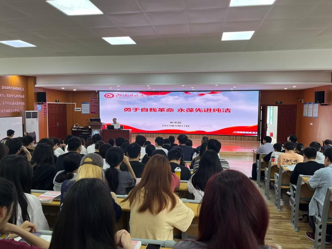本网讯(通讯员 黄雷 文/图)5月17日上午,校党委常委、纪委书记、监察专员张文凯以“勇于自我革命 永葆先进纯洁”为主题,在思政讲堂为软件技术、信息安全技术专业学生讲授了一堂生动的专题思政课。